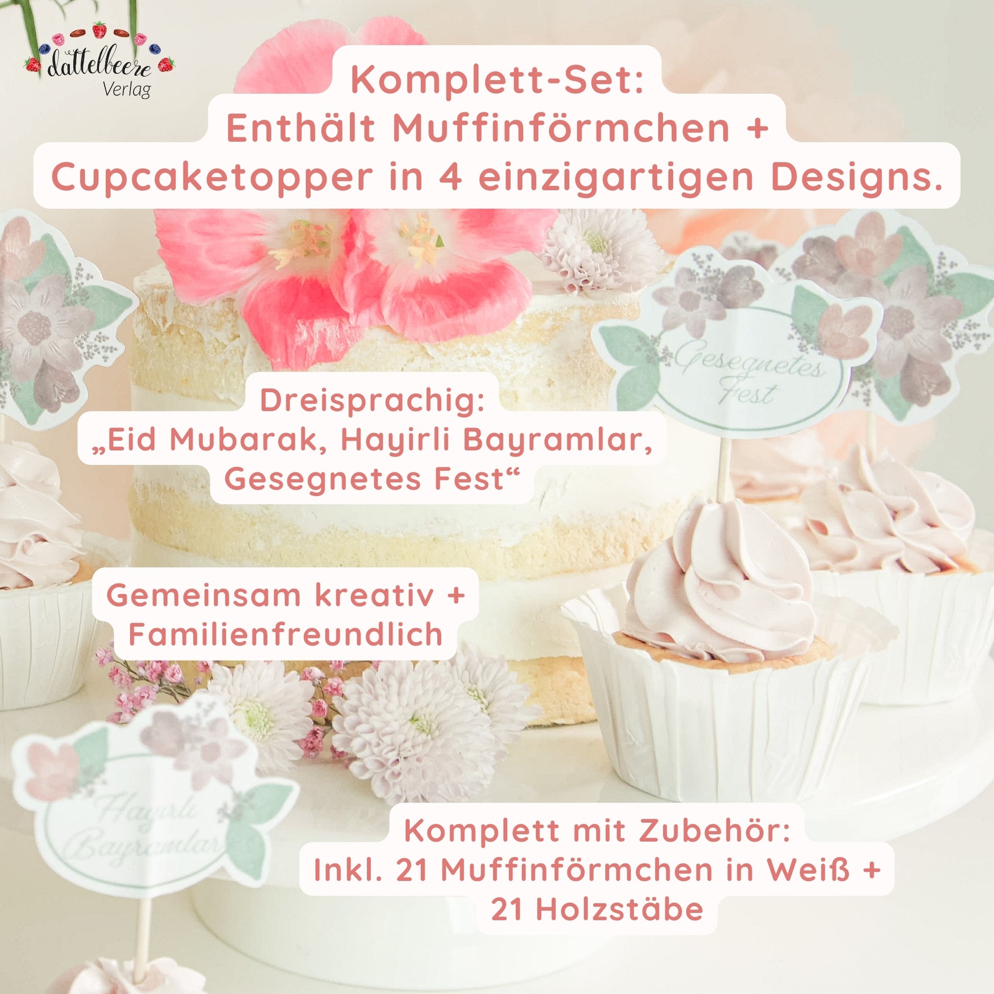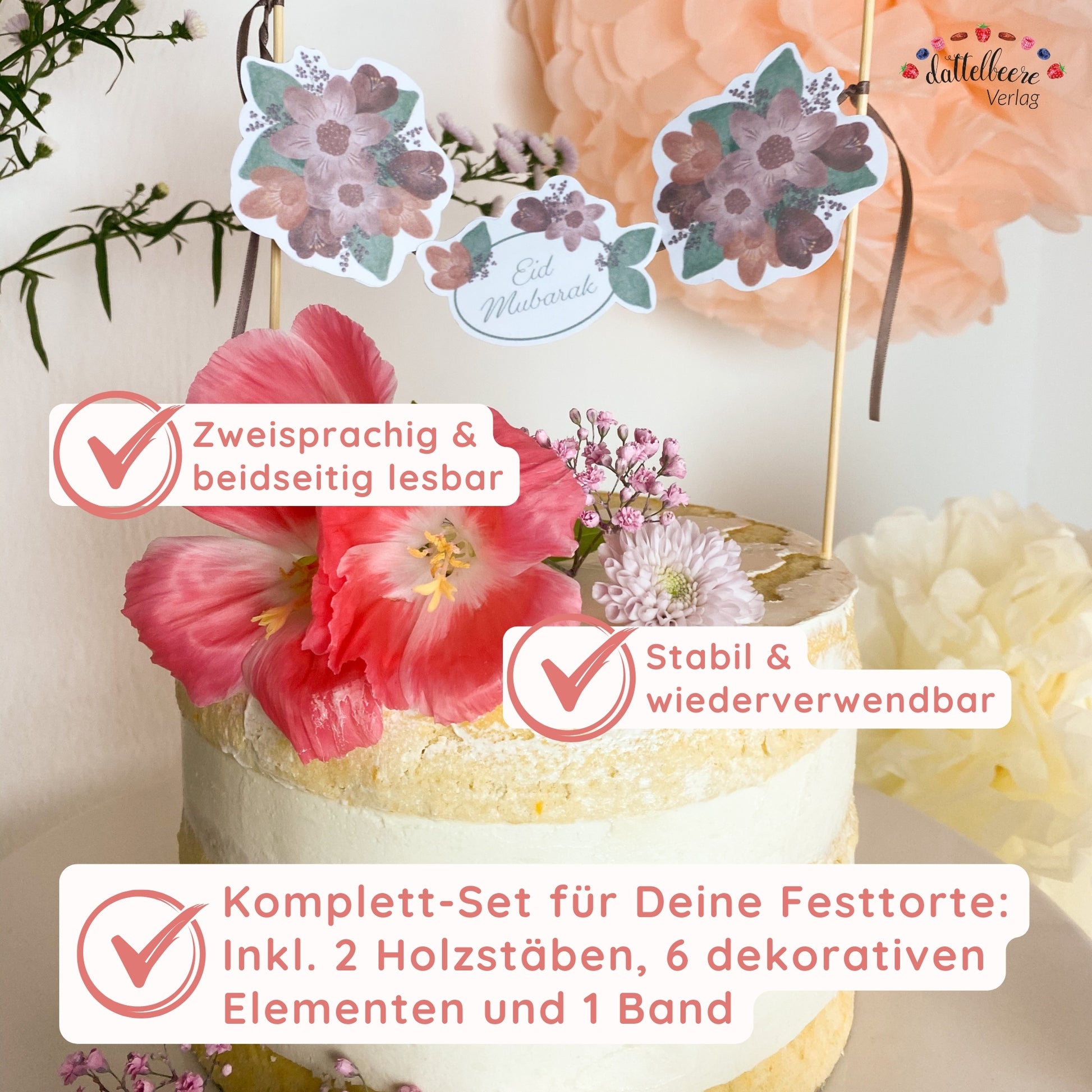 - 1 Caketopper "Blumige Festtage" (Vorderseite: „Eid Mubarak“; Rückseite: „Hayirli Bayramlar“)