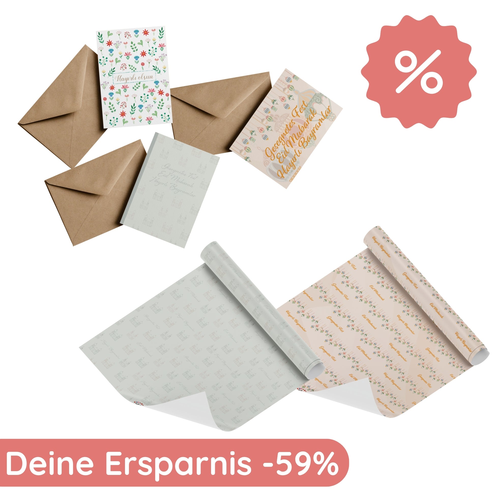 Im Paket enthalten sind zwei stilvolle Geschenkpapier-Sets (Modern Mosque und Ramadanfest) sowie drei hochwertige Grußkarten mit Umschlag. Mit Designs auf Deutsch, Türkisch und Arabisch kannst Du persönliche Grüße überbringen und Deine Geschenke individuell verpacken.