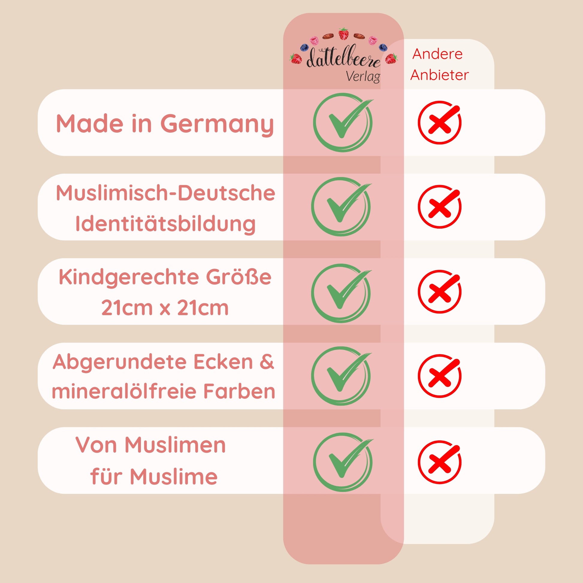 Gerade in einer pluralen Gesellschaft schenkt dieses Buch Kindern Worte und Bilder für Zugehörigkeit, Stolz und Offenheit. Es stärkt ihre muslimische Identität, ohne zu belehren, und schafft Gesprächsanlässe für Familie, Kita, Schule oder Moschee.