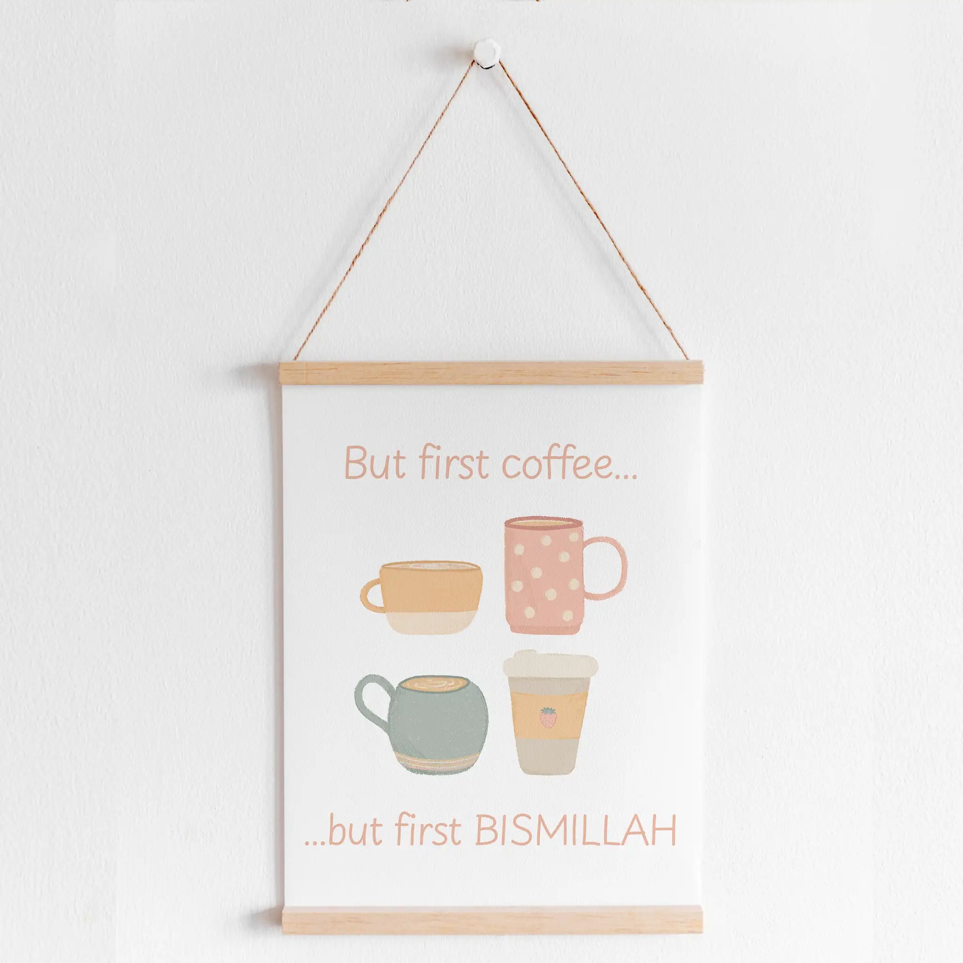 Ein liebevolles Poster, das daran erinnert: Kaffee schmeckt am besten mit Bismillah. Vier stilvoll illustrierte Tassen in warmen Farben machen es zu einem besonderen Hingucker für Küche, Büro oder Wohnzimmer.