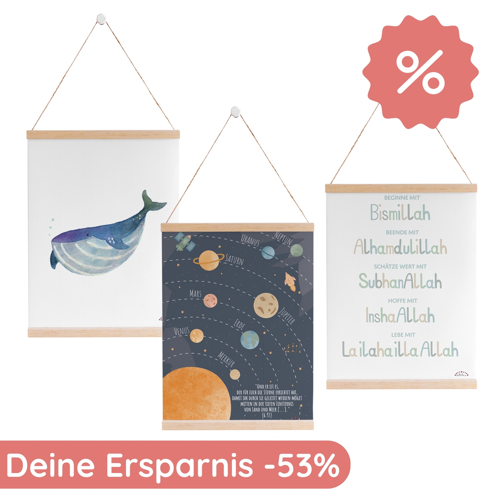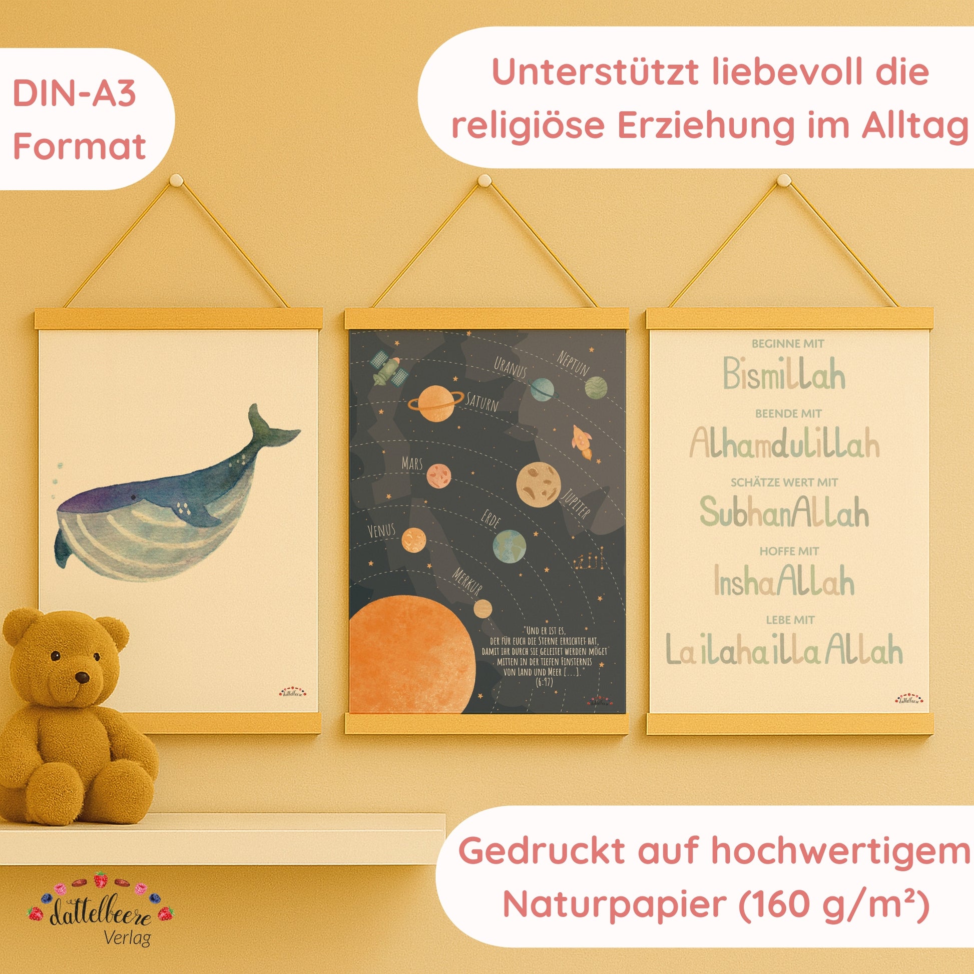 Mit dem Poster „Wal“ wird die Verbindung von Natur und Quran sichtbar und kindgerecht erklärt. Das Poster „Weltraum“ regt die Fantasie an und eröffnet spannende Gespräche über Allahs Schöpfung und die Weite des Universums. Abgerundet wird das Set durch das Poster „Beginne mit Bismillah“, das Kinder und Erwachsene täglich daran erinnert, bewusst und mit guter Absicht zu handeln.
