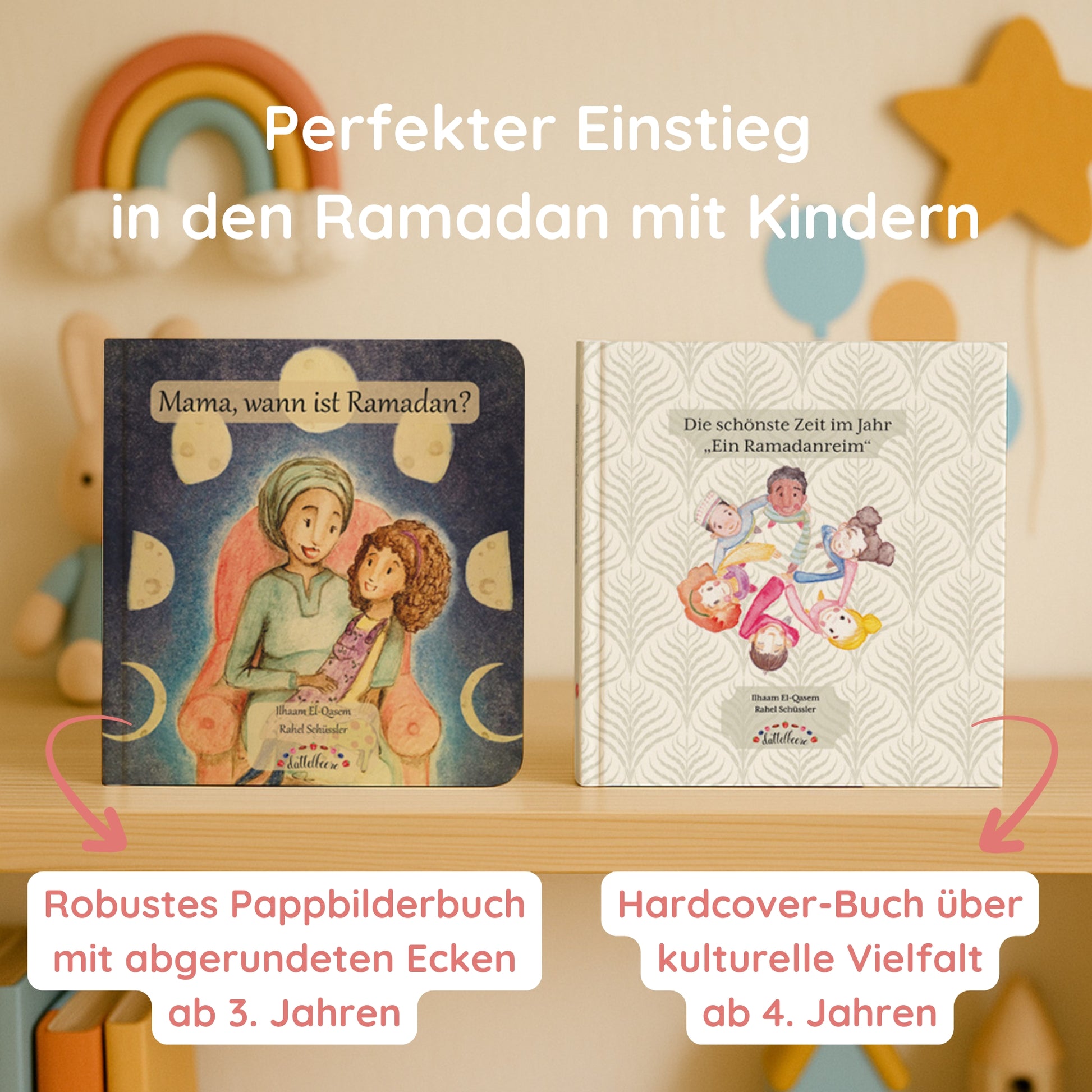 Enthalten sind die Titel „Mama, wann ist Ramadan?“ und „Die schönste Zeit im Jahr“ von Ilhaam El Qasem und Rahel Schüssler. Beide Bücher sind kindgerecht geschrieben, farbenfroh illustriert und vermitteln spielerisch Wissen über den Fastenmonat sowie die Freude an Traditionen. Sie regen Gespräche in der Familie an, fördern das Verständnis für den Islam und stärken die muslimische Identität der Kinder.
